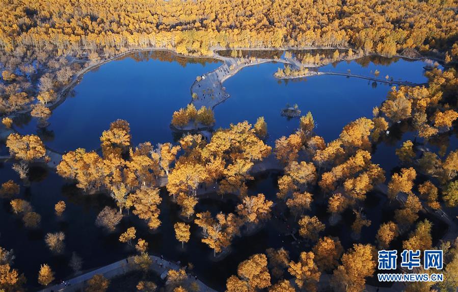 10月21日无人机拍摄的金塔沙漠胡杨林景区。 金秋时节,位于甘肃省酒泉市金塔县的金塔沙漠胡杨林景区一片金黄,胡杨林在一池碧水的映衬下格外美丽。 新华社记者 马宁 摄