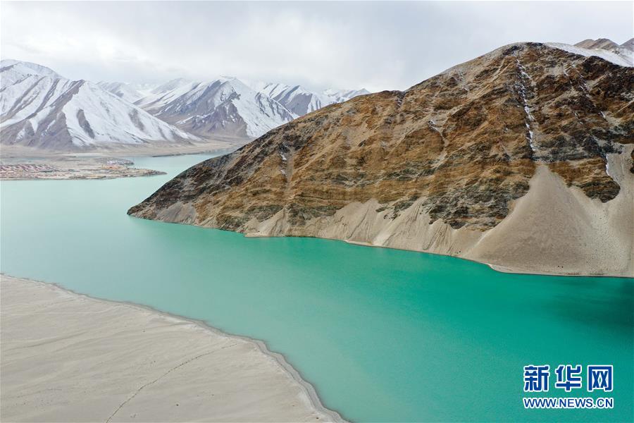 新疆阿克陶县白沙湖一景(10月21日无人机拍摄)。 深秋时节,新疆帕米尔高原雪山连绵起伏,湖水波光潋滟,在蓝天白云的映衬下呈现出一幅幅美丽的画卷。 新华社记者 丁磊 摄