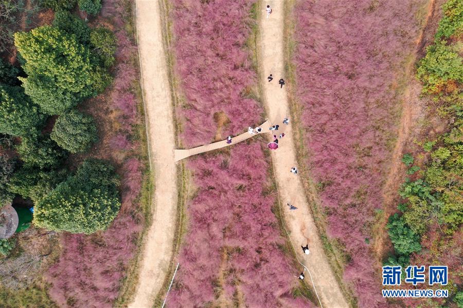 10月6日,在江西省南昌市南昌县凤凰沟景区,游客在粉黛乱子草丛中拍照游玩(无人机拍摄)。 新华社记者 彭昭之 摄