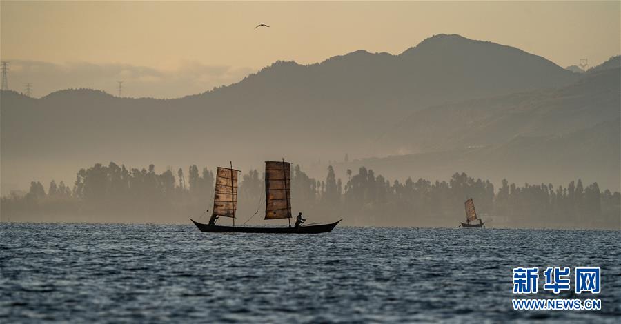 10月23日,渔船在晨光中出航。 连日来,云南昆明天朗气清,滇池风光旖旎、美不胜收。 新华社记者江文耀摄