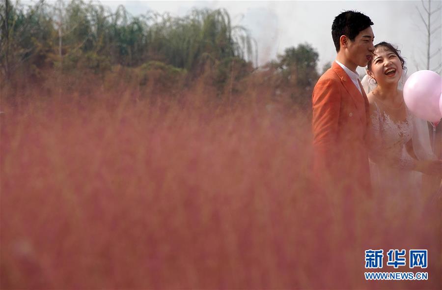 10月23日,一对新人在郑州龙湖湿地公园拍摄婚纱照。 近日,河南省郑州龙湖湿地公园内的粉黛乱子草进入盛开期,成片的“粉色海洋”吸引市民前来观赏拍照。 新华社记者 李安 摄