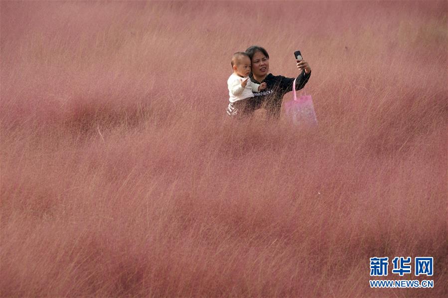 10月23日,市民在郑州龙湖湿地公园自拍。 近日,河南省郑州龙湖湿地公园内的粉黛乱子草进入盛开期,成片的“粉色海洋”吸引市民前来观赏拍照。 新华社记者 李安 摄