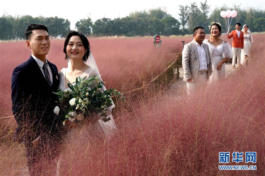 10月23日,新人在郑州龙湖湿地公园拍摄婚纱照。 近日,河南省郑州龙湖湿地公园内的粉黛乱子草进入盛开期,成片的“粉色海洋”吸引市民前来观赏拍照。 新华社记者 李安 摄