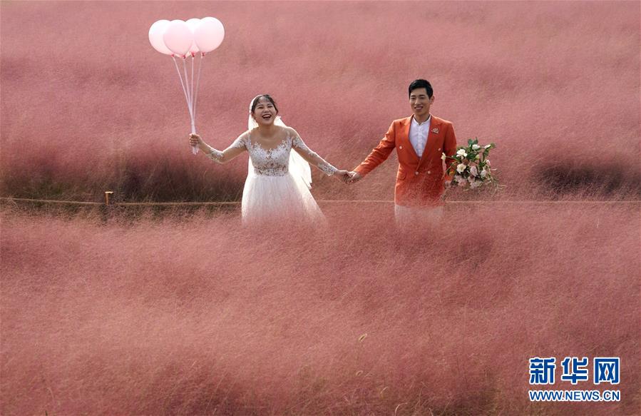 10月23日,一对新人在郑州龙湖湿地公园拍摄婚纱照。 近日,河南省郑州龙湖湿地公园内的粉黛乱子草进入盛开期,成片的“粉色海洋”吸引市民前来观赏拍照。 新华社记者 李安 摄