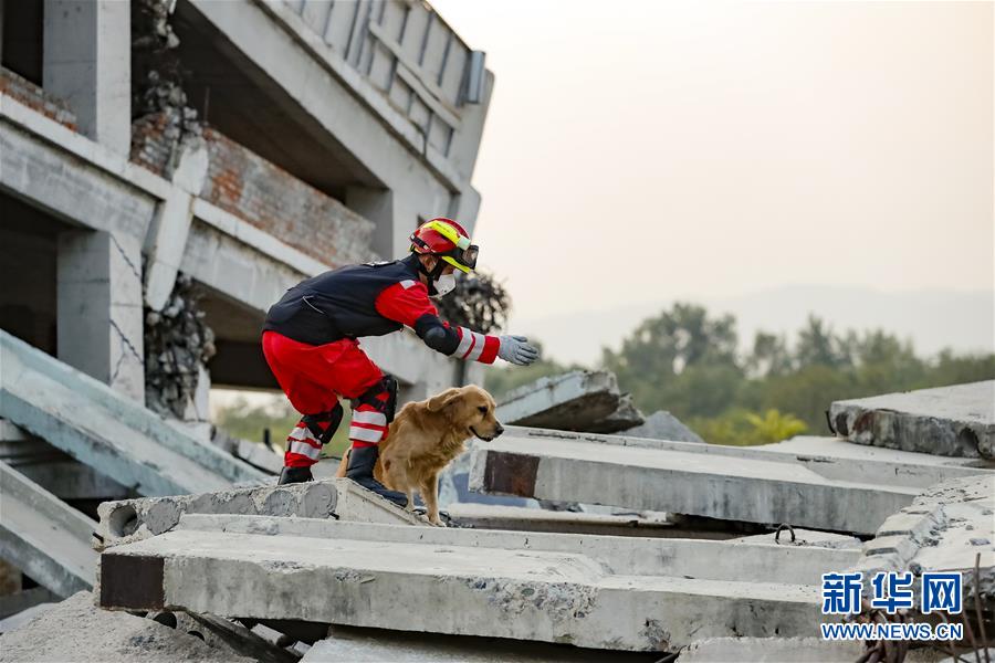 10月22日,中国国际救援队在位于北京的国家地震紧急救援训练基地进行地震搜救演练,这是队员携带搜救犬在“地震现场”搜救。 新华社记者 沈伯韩 摄