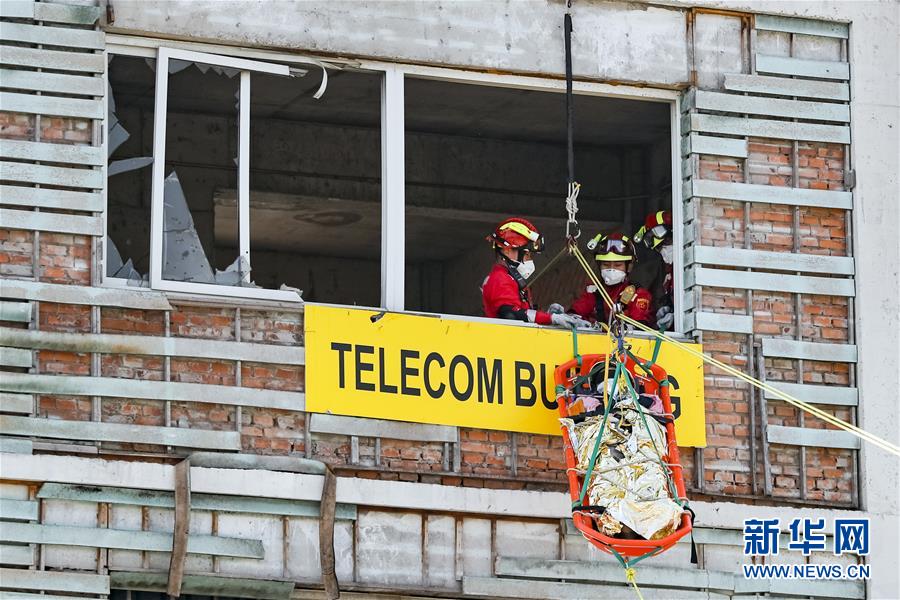 10月22日,中国国际救援队在位于北京的国家地震紧急救援训练基地进行地震搜救演练,这是队员在“地震现场”利用转运系统将“幸存者”从高处斜向转移至地面。新华社记者 沈伯韩 摄