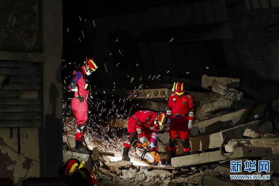 10月21日晚,中国国际救援队在位于北京的国家地震紧急救援训练基地进行地震搜救演练,这是队员在“地震现场”破拆营救通道。 新华社记者 沈伯韩 摄