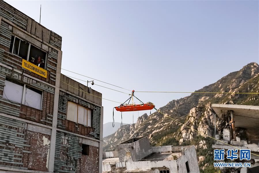 10月22日,中国国际救援队在位于北京的国家地震紧急救援训练基地进行地震搜救演练,这是队员在“地震现场”利用转运系统将“幸存者”从高处斜向转移至地面。 新华社记者 沈伯韩 摄