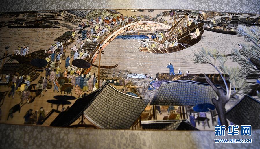 这是10月23日在张小红的工作室内拍摄的夏布绣《清明上河图》的局部。 新华社记者 胡晨欢 摄