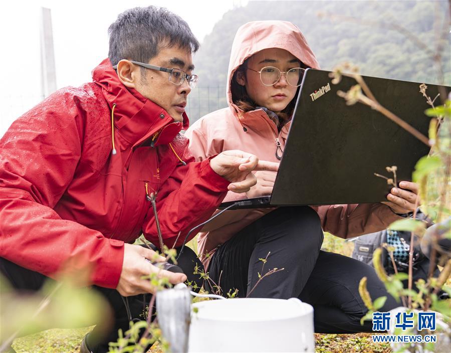 科研人员在读取雅鲁藏布大峡谷的降水数据(10月21日摄)。 新华社记者孙非 摄