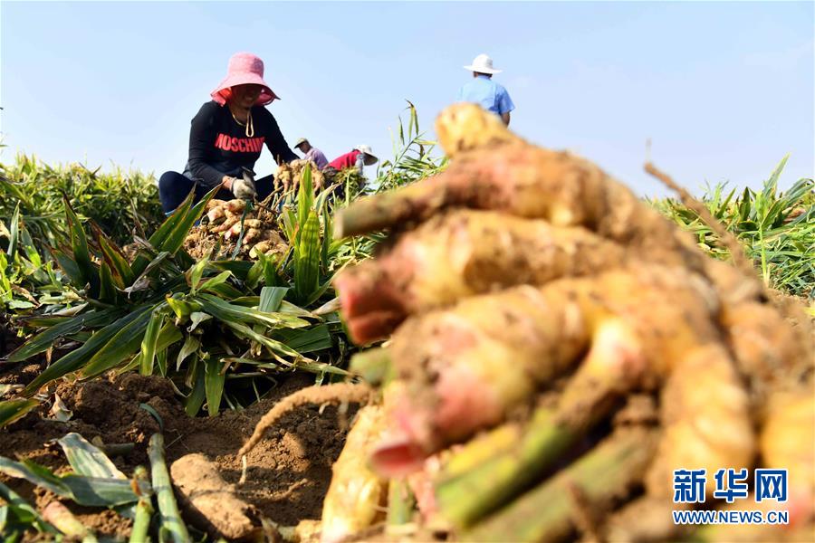 10月24日,在乳山市白沙滩镇,姜农在收获大姜。 金秋时节,山东省乳山市大姜喜获丰收,姜农们在田间忙碌收获。目前,乳山市大姜种植面积近5万亩,成为当地促进农民增收致富的特色产业之一。 新华社记者 郭绪雷 摄