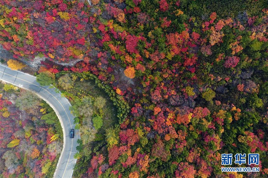 车辆行驶在山西省太原市玉泉山盘山公路上(10月22日无人机拍摄)。
