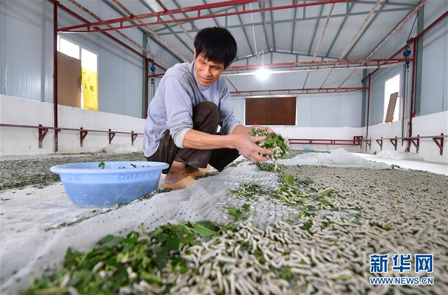10月24日,在广西柳州市鹿寨县黄冕镇石门村扶贫产业园标准蚕房里,村民潘维刚将蚕虫转移到新的蚕房。目前,潘维刚养蚕年收入达六七万元,已于2016年实现脱贫。 广西柳州市鹿寨县黄冕镇石门村地处偏僻,曾是一个贫困村。一直以来,种桑养蚕是当地村民的主要经济来源。由于技术缺乏、生产设备落后等,村民的收入不高。近年来,黄冕镇大力发展种桑养蚕特色脱贫产业,在该镇石门村创建现代桑蚕业示范区,建设18个扶贫产业园标准蚕房,运用轨道喂蚕、自动化上簇、水帘空调补湿降温等技术,提高桑蚕养殖效益,使传统养蚕业生产模式实现转型升级。2017年,石门村实现脱贫摘帽。 新华社记者 黄孝邦 摄