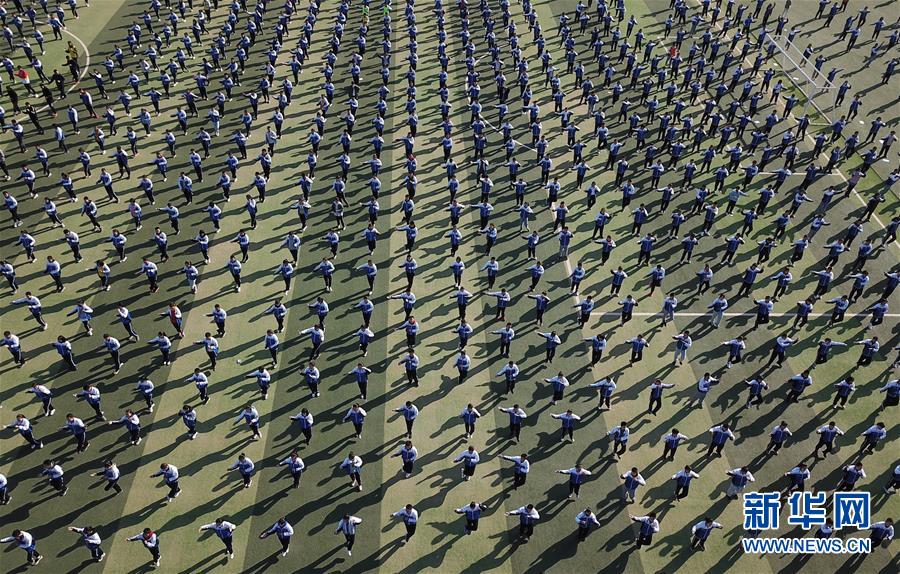 10月25日,在敦煌中学,学生们在课间做包含敦煌舞元素的课间操(无人机拍摄)。 近年来,甘肃省敦煌市大力推广敦煌舞,不仅举办了免费的敦煌舞培训班,还将敦煌舞的动作与广场舞、课间操等结合,让越来越多的人了解敦煌舞。敦煌舞是依托敦煌元素进行的艺术创作,大量舞蹈动作和造型均源自敦煌壁画。 新华社记者 马宁 摄