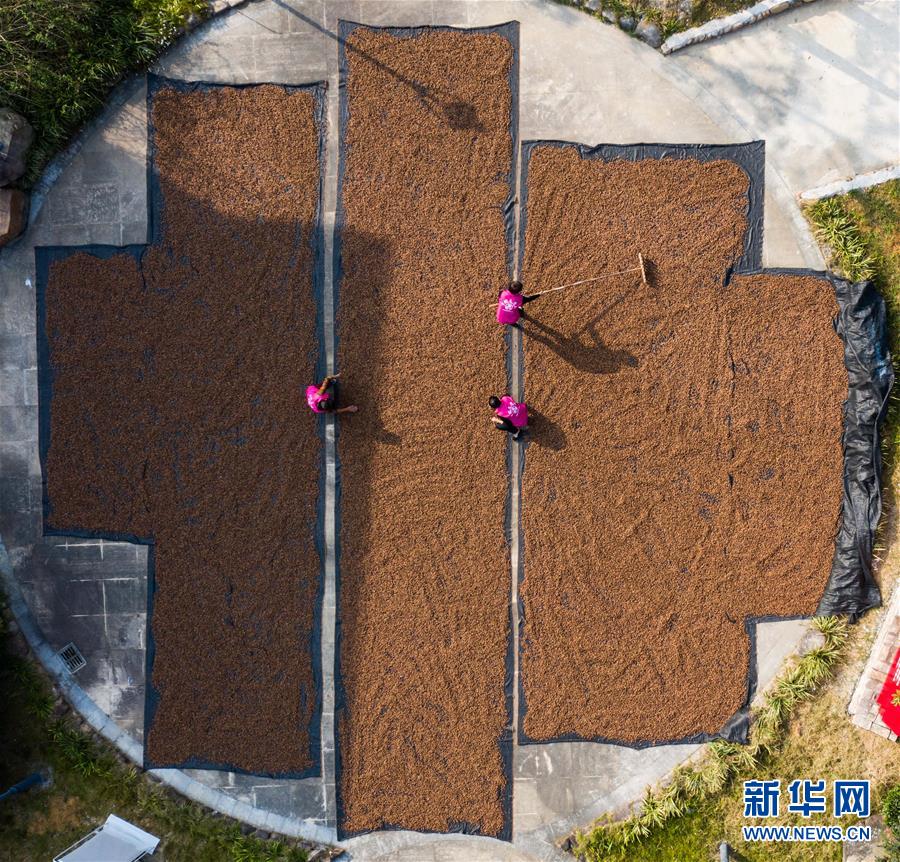 10月25日,锦源村的党员志愿者在村里帮助晾晒香榧果(无人机拍摄)。 近日,浙江省杭州市临安区锦南街道锦源村的1500多亩香榧林进入了收获季节,种植户们晾晒、炒制香榧果,预计将带来300万元左右的销售收入。从2008年开始,地处山区、经济薄弱的锦源村通过政策、资金推动当地百姓大规模种植香榧树,如今这些香榧树进入了盛产期,成了山乡百姓的“摇钱树”,极大促进了乡村集体经济发展和百姓增收,推动当地乡村振兴。 新华社记者 徐昱 摄