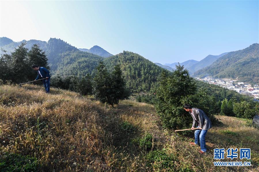 10月25日,种植户在锦源村的香榧林中进行除草等林间管理。 近日,浙江省杭州市临安区锦南街道锦源村的1500多亩香榧林进入了收获季节,种植户们晾晒、炒制香榧果,预计将带来300万元左右的销售收入。从2008年开始,地处山区、经济薄弱的锦源村通过政策、资金推动当地百姓大规模种植香榧树,如今这些香榧树进入了盛产期,成了山乡百姓的“摇钱树”,极大促进了乡村集体经济发展和百姓增收,推动当地乡村振兴。 新华社记者 徐昱 摄