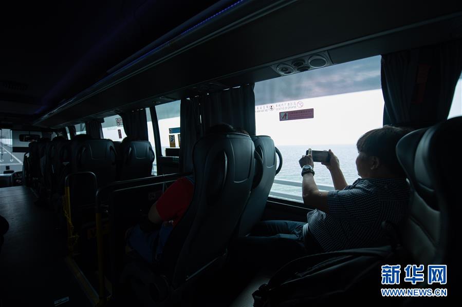 10月24日上午,一名乘客在往香港方向的港珠澳大桥穿梭巴士上拍照。 2018年10月23日,港珠澳大桥正式开通。在这座圆梦桥、同心桥、自信桥、复兴桥开通一周年之际,记者亲自体验“一桥连三地、一日游三城”的悠闲与便利,于不同的旖旎风光中自在游览,在不同的城市风貌间自如切换。 新华社记者 张金加 摄