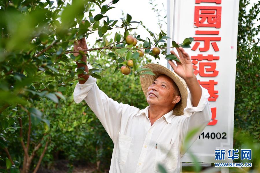 在河南省信阳市光山县槐店乡,农民在联兴油茶基地查看油茶果生长状况(9月4日摄)。新华社记者冯大鹏摄