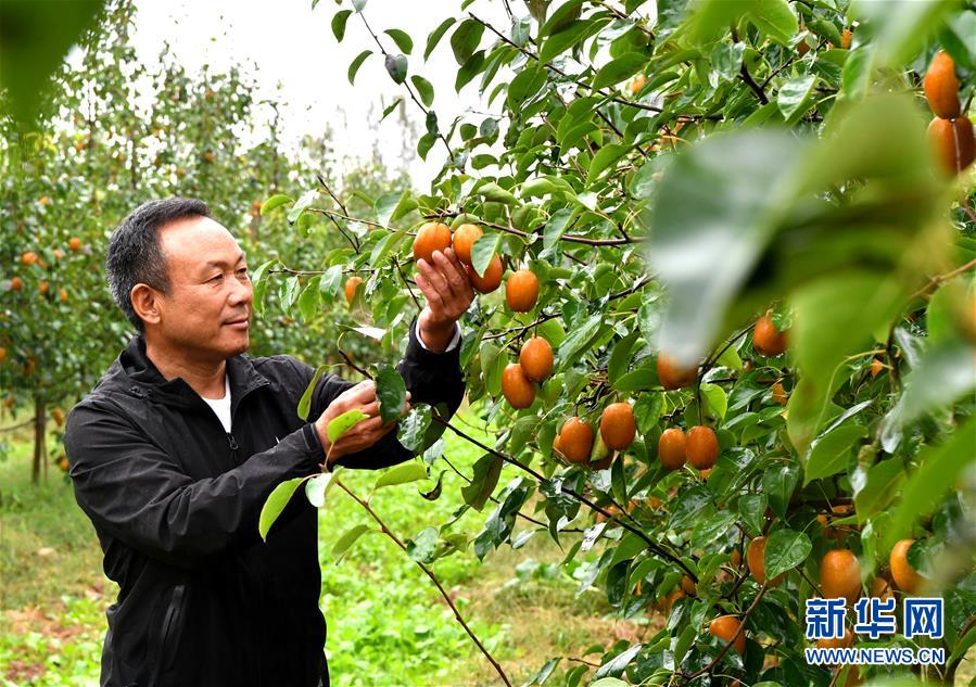 种植户李应贤在河南省洛宁县马店镇关庙村查看金珠沙梨生长情况(10月9日摄)。 新华社记者李嘉南摄