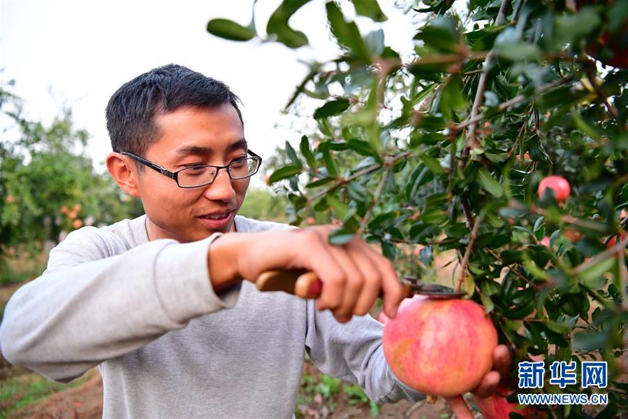 在河南省南阳市淅川县九重镇张河村,农民在软籽石榴基地采摘石榴(10月19日摄)。新华社记者冯大鹏摄