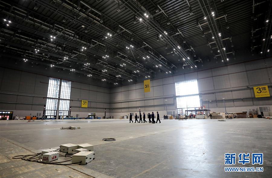 10月25日,在展馆内,展台框架搭建工作正在进行。 第二届中国国际进口博览会开幕在即,在进博会举办地、国家会展中心(上海)内,展馆搭建施工人员和展会志愿者们在进行从展台搭建到完善观展标识等的布展准备工作。 新华社记者 方喆摄