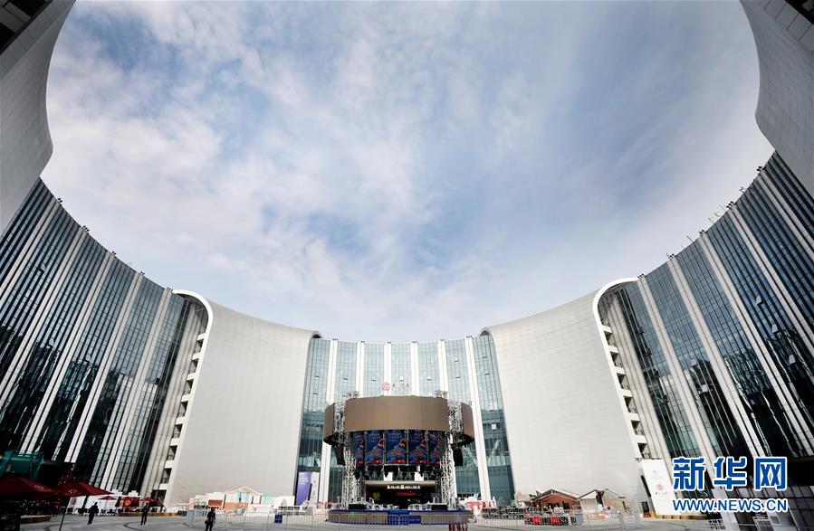 这是10月25日拍摄的位于国展中心中央广场的进博会中央舞台(中下)。 第二届中国国际进口博览会开幕在即,在进博会举办地、国家会展中心(上海)内,展馆搭建施工人员和展会志愿者们在进行从展台搭建到完善观展标识等的布展准备工作。 新华社记者 方喆摄