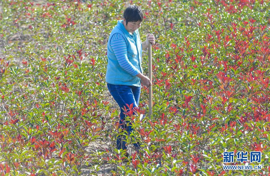 10月25日,在河北省故城县故城瀛雪园林场多彩苗木种植基地,工作人员为红叶石楠松土。新华社记者李晓果摄