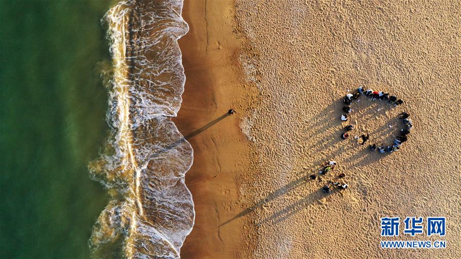 在日照市山海天旅游度假区,一群游客在沙滩上进行活动(10月26日无人机拍摄)。 从空中俯瞰山东省日照市山海天旅游度假区,碧海、沙滩等构成一幅美丽的海滨画卷。 新华社记者王凯摄