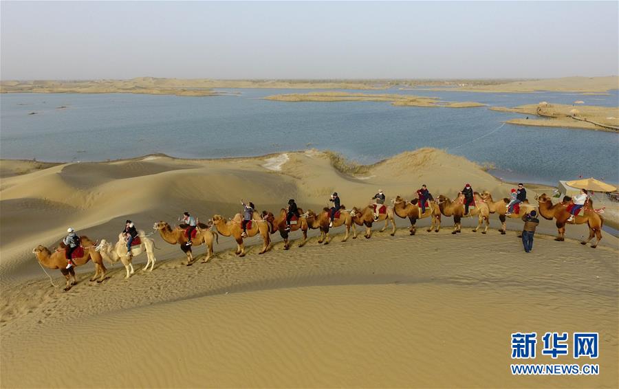 10月26日,在新疆尉犁县罗布人村寨,游客骑着骆驼前往大漠胡杨景点(无人机拍摄)。 金秋十月,在新疆南部的塔里木盆地,金色胡杨迎来最美季节,吸引大批游客前来观赏。来自新疆维吾尔自治区文化和旅游厅的数据显示,今年1-9月,新疆接待国内外游客18385.84万人次,同比增长40.9%;实现旅游收入3046.38亿元,同比增长40.78%,均创历史新高。 新疆塔里木河流域胡杨林面积达1500万亩,这些广泛分布于河流两岸的植被,不仅生命力顽强,而且阻隔了我国第一大沙漠塔克拉玛干沙漠的侵袭,也构成了“大漠胡杨”“水韵胡杨”等美景。 新华社记者 赵戈 摄