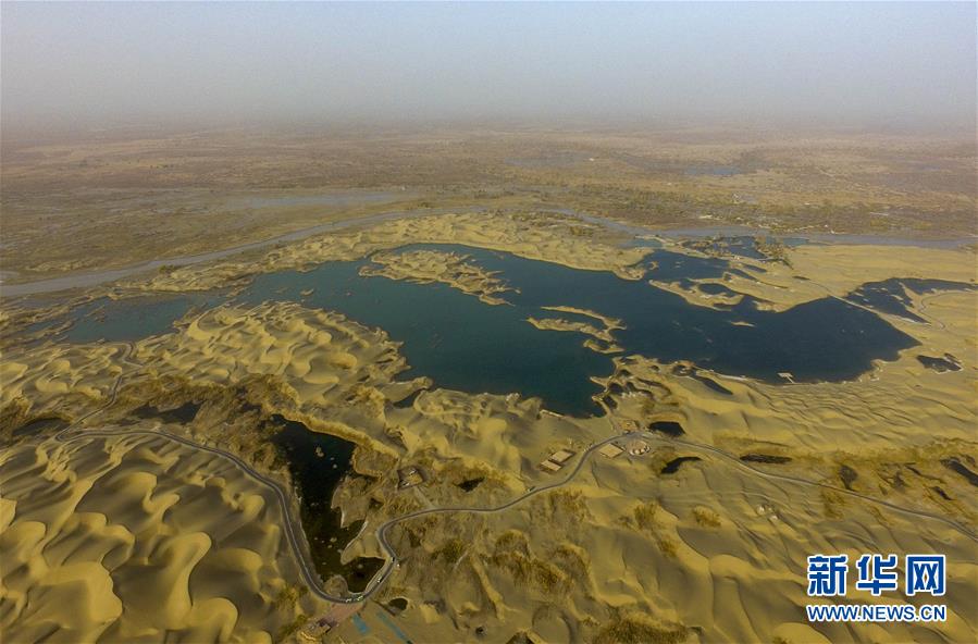 这是从空中俯瞰新疆尉犁县罗布人村寨内的神女湖景点(10月26日无人机拍摄)。 金秋十月,在新疆南部的塔里木盆地,金色胡杨迎来最美季节,吸引大批游客前来观赏。来自新疆维吾尔自治区文化和旅游厅的数据显示,今年1-9月,新疆接待国内外游客18385.84万人次,同比增长40.9%;实现旅游收入3046.38亿元,同比增长40.78%,均创历史新高。 新疆塔里木河流域胡杨林面积达1500万亩,这些广泛分布于河流两岸的植被,不仅生命力顽强,而且阻隔了我国第一大沙漠塔克拉玛干沙漠的侵袭,也构成了“大漠胡杨”“水韵胡杨”等美景。 新华社记者 赵戈 摄