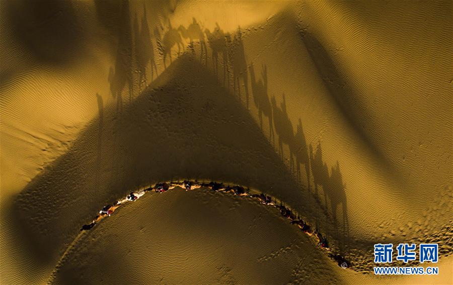 10月26日,游客骑着骆驼在新疆尉犁县罗布人村寨内欣赏沙漠美景(无人机拍摄)。 金秋十月,在新疆南部的塔里木盆地,金色胡杨迎来最美季节,吸引大批游客前来观赏。来自新疆维吾尔自治区文化和旅游厅的数据显示,今年1-9月,新疆接待国内外游客18385.84万人次,同比增长40.9%;实现旅游收入3046.38亿元,同比增长40.78%,均创历史新高。 新疆塔里木河流域胡杨林面积达1500万亩,这些广泛分布于河流两岸的植被,不仅生命力顽强,而且阻隔了我国第一大沙漠塔克拉玛干沙漠的侵袭,也构成了“大漠胡杨”“水韵胡杨”等美景。 新华社记者 赵戈 摄