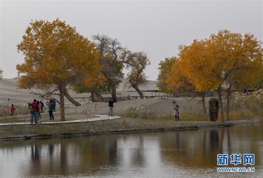 10月26日,游客在新疆尉犁县罗布人村寨内欣赏水韵胡杨美景。 金秋十月,在新疆南部的塔里木盆地,金色胡杨迎来最美季节,吸引大批游客前来观赏。来自新疆维吾尔自治区文化和旅游厅的数据显示,今年1-9月,新疆接待国内外游客18385.84万人次,同比增长40.9%;实现旅游收入3046.38亿元,同比增长40.78%,均创历史新高。 新疆塔里木河流域胡杨林面积达1500万亩,这些广泛分布于河流两岸的植被,不仅生命力顽强,而且阻隔了我国第一大沙漠塔克拉玛干沙漠的侵袭,也构成了“大漠胡杨”“水韵胡杨”等美景。 新华社记者 赵戈 摄