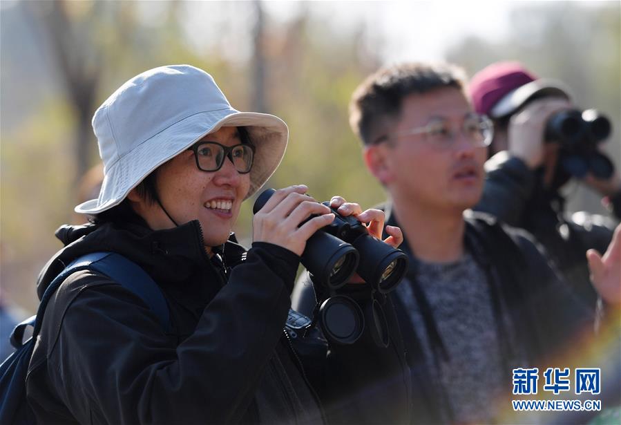 10月27日,在北京野鸭湖国家湿地公园,自然爱好者用望远镜观察树林中的鸟类。新华社记者 陶希夷 摄