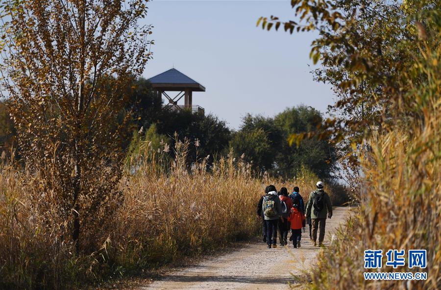 10月27日,自然爱好者向野鸭湖的观鸟瞭望台走去。 新华社记者 陶希夷 摄