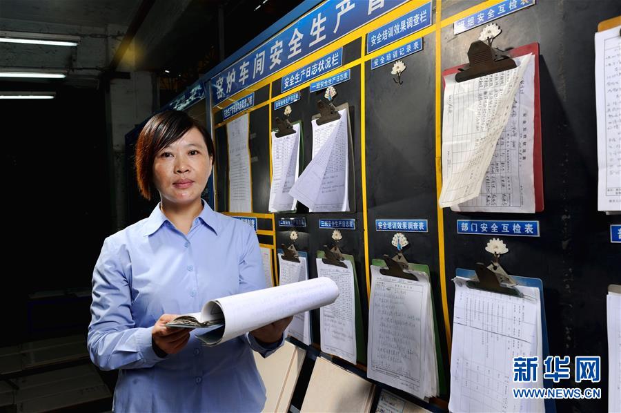 首批农民工全国人大代表之一胡小燕在曾经工作过的陶瓷厂检查职工权益保护工作(2013年11月5日摄)。新华社记者 刘大伟 摄