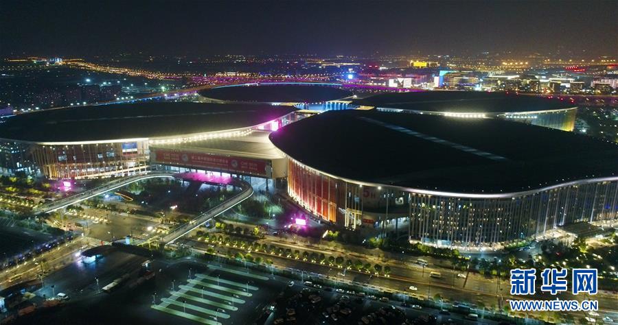 2019年11月5日,第二届中国国际进口博览会将在上海开幕。 夜幕下的国家会展中心(上海)灯光璀璨,流光溢彩,静待八方宾客。 新华社记者 丁汀 摄