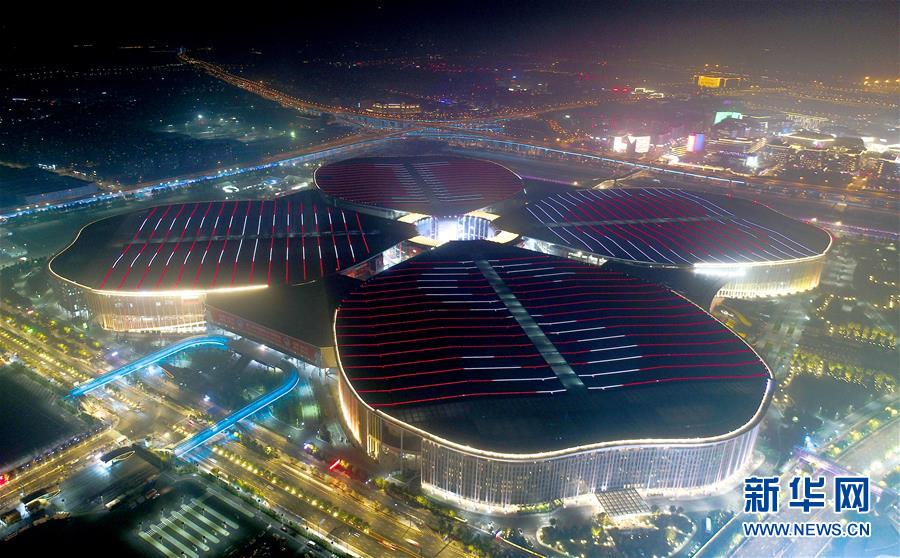 夜幕下的第二届中国国际进口博览会举办场地——国家会展中心(上海)(10月28日摄)。 第二届中国国际进口博览会将于11月5日在上海开幕。 新华社记者 丁汀 摄