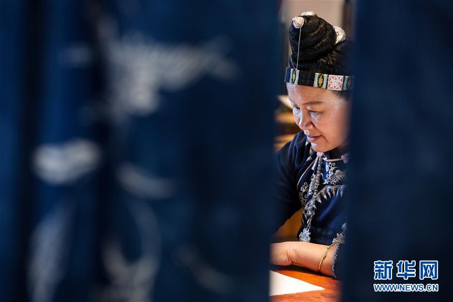 10月29日,杨芳在位于丹寨万达小镇内的工作室内绘制蜡染图案。新华社记者 欧东衢 摄
