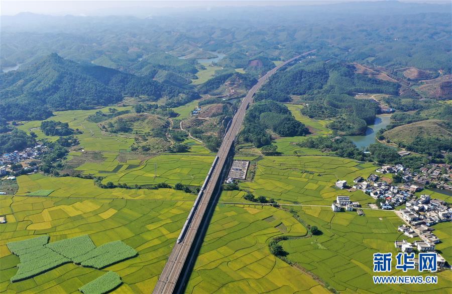 10月29日,列车从广西宾阳县古辣镇丰收的稻田间驶过(无人机拍摄)。新华社记者 陆波岸 摄