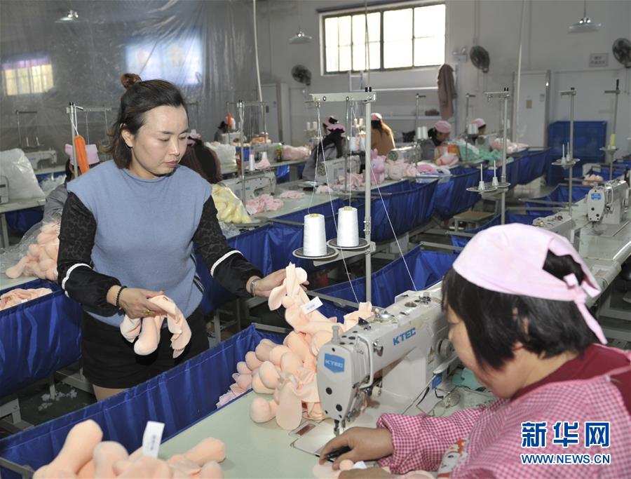 10月29日,工作人员在洛宁县长水镇产业扶贫基地的一家毛绒玩具厂的缝纫车间内忙碌。新华社记者戚文娟摄