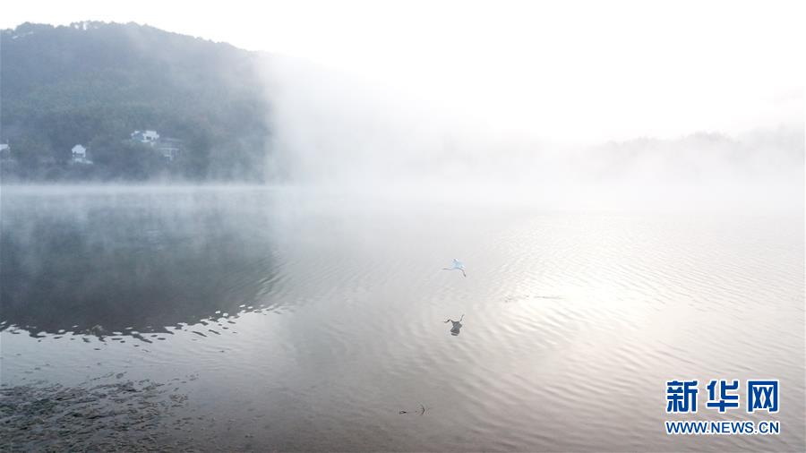 10月30日,一只鸟在奇墅湖湖面上飞翔。 安徽省黄山市黟县的奇墅湖晨雾缭绕,美如画卷。 新华社记者 张端 摄