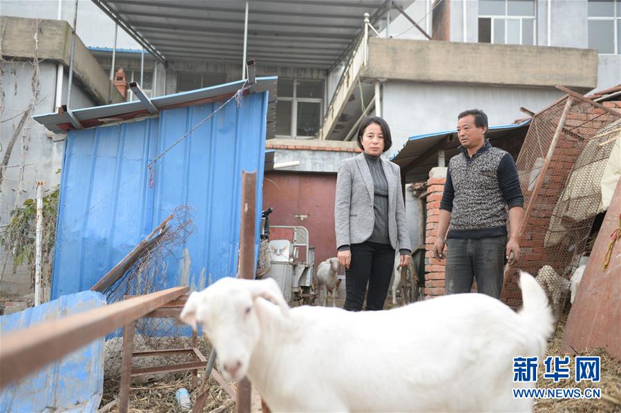 10月29日,刘双燕(左)和养殖户周亚军交流羊的生长情况。周亚军从养殖一只“扶贫羊”开始,经过多次繁殖,发了“羊财”,最终成功脱贫。 新华社发(黄博涵 摄)