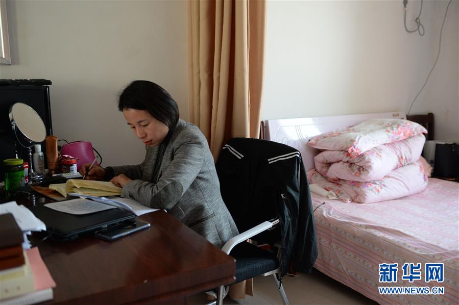 10月29日,刘双燕在利辛县汝集镇朱集村的村部办公室内整理工作日志。她的办公室同时也是她的宿舍,中间用一道窗帘隔开。新华社发(黄博涵 摄)
