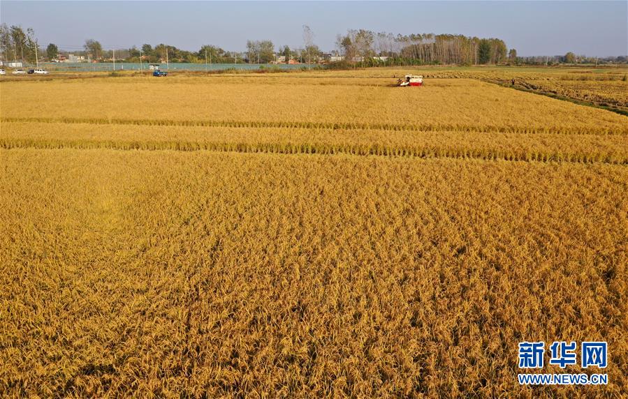 10月30日,新蔡县关津乡牛湾村的种植户驾驶收割机收获水稻(无人机拍摄)。新华社记者李嘉南摄