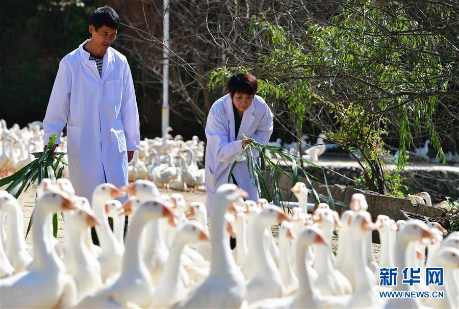 10月31日,徐丽妹(右)和贫困户兰荣繁给白鹅喂食。兰荣繁原先一年收入两千多元,现在他在合作社养鹅,年收入五万,已经脱贫。新华社记者 魏培全 摄