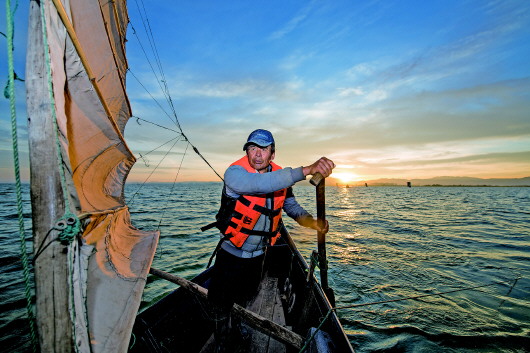 10月22日,渔民李培光在船尾掌舵,身后的太阳刚刚升起。