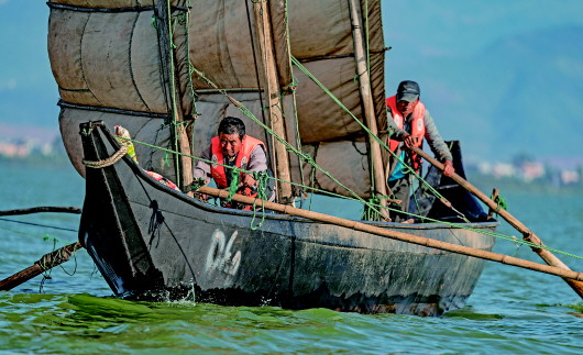 10月23日,风力不足时,渔民张开弟(左)与李培光划船助力。