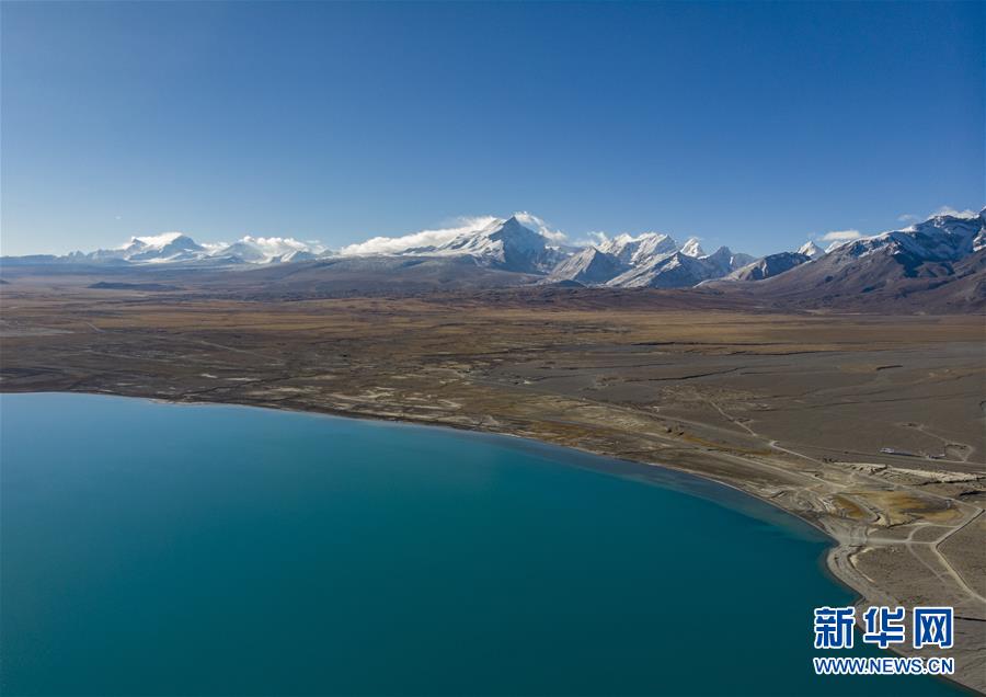 雪山脚下的佩枯错(10月31日无人机拍摄)。 佩枯错位于西藏日喀则市吉隆县与聂拉木县交界处,面积约300平方公里,湖面海拔4590米,是珠峰保护区内最大的内陆湖泊。 新华社记者孙非摄