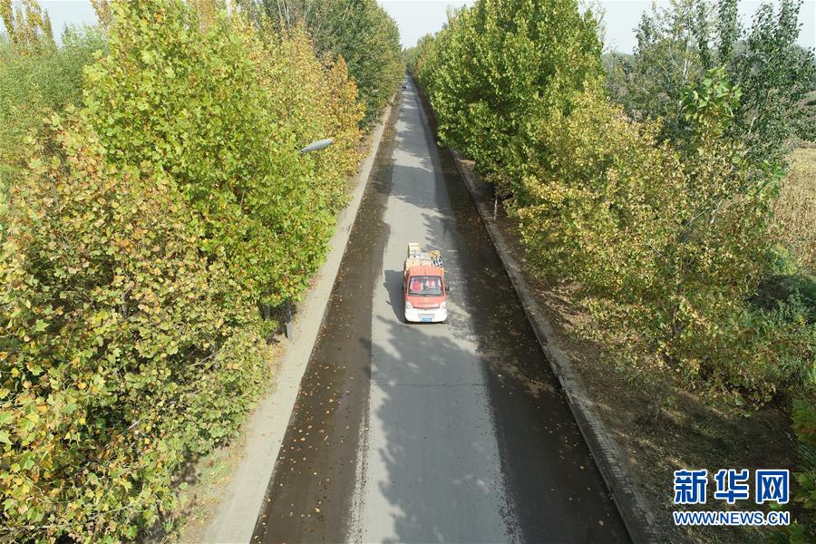 11月1日,河北威县“供销e家”送货车行驶在送货路上(无人机拍摄)。新华社记者 邢广利 摄