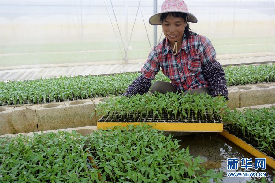 在广西天等县一处辣椒种植基地务工的贫困户马红莉在辣椒育苗大棚里查看缺苗情况(10月5日摄)。新华社记者 覃星星 摄